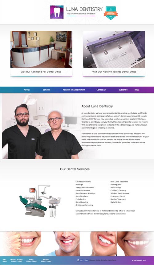 Since Luna Dentistry is a multi-location practice, to create a cohesive design that integrated both their locations, UpOnline started with a user friendly landing page that split into two separate home pages for each location, one for Richmond Hill and the other for Midtown Toronto. Additionally it provided opportunities to increase Search Engine Optimization (SEO), with each location accessible from its own domain and the landing pages.